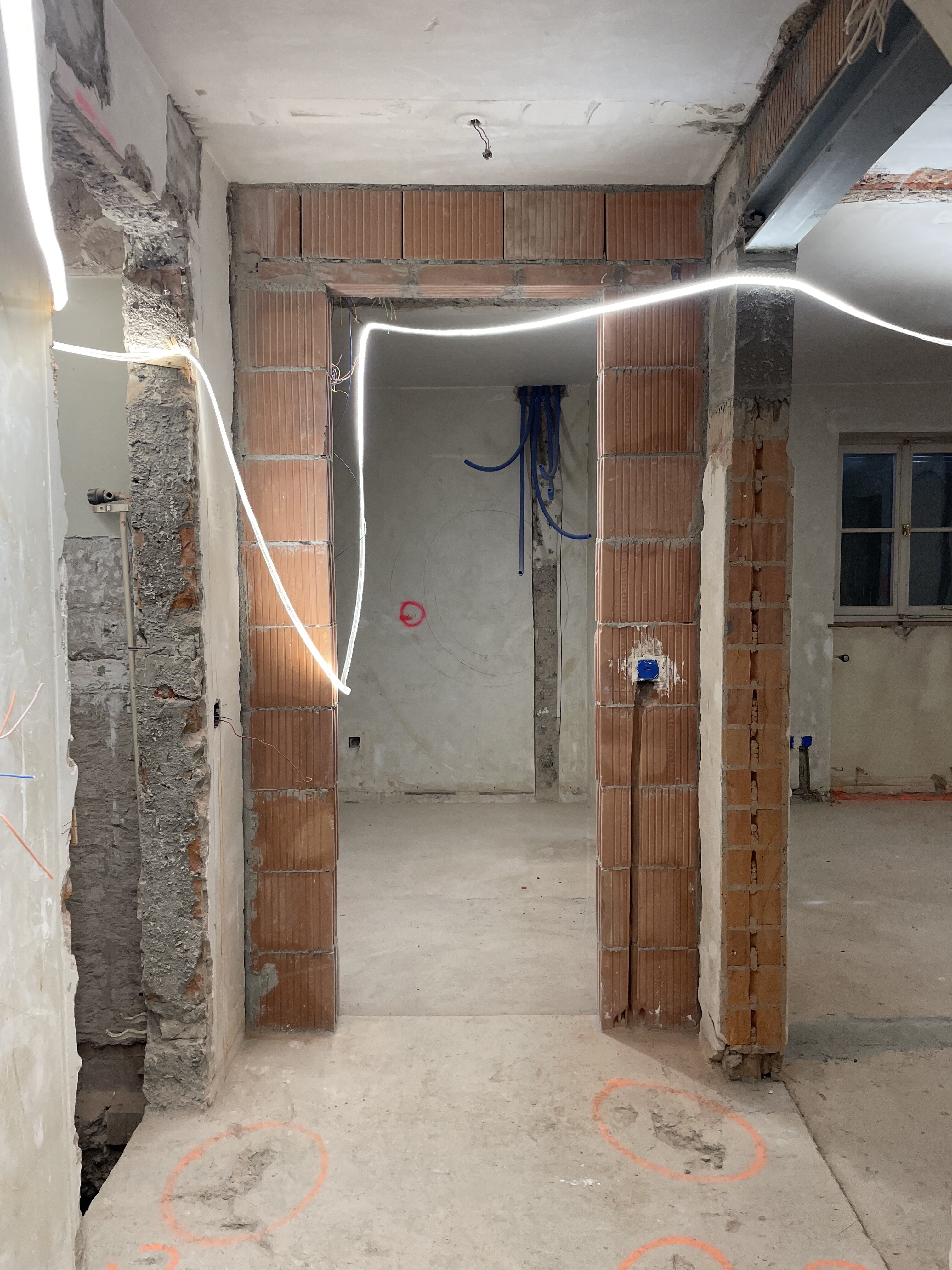 Im Erdgeschoss wurde die Küche geöffnet und räumlich neu verknüpft; die vorhandenen Bodenplatten konnten im Anschlussbereich weitergeführt und ergänzt werden. Der Wohnraumboden wurde in seiner Farbigkeit an die warmen Rottöne des Eingangsbereichs angenähert und stärkt damit die räumliche Kontinuität. Im Gartengeschoss wurden einzelne Fenster zu Türen erweitert, um einen direkten Zugang zum Außenraum zu schaffen. Gleichzeitig erforderte die Situation des Untergeschosses eine vollständige radondichte Abdichtung.