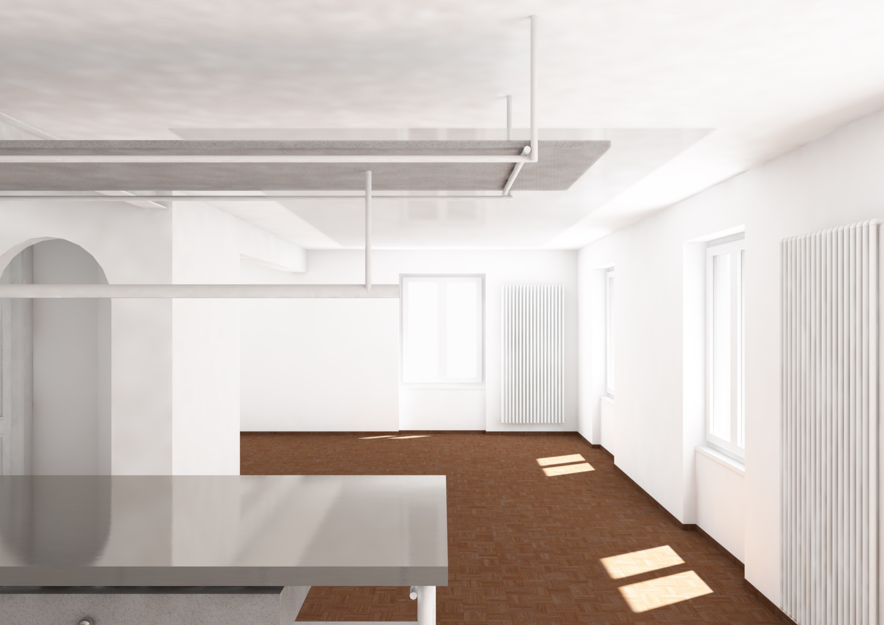Die bestehende Ölheizung wurde vollständig zurückgebaut und durch eine Luftwärmepumpe ersetzt. Die Verteilstruktur sowie die alten Konvektoren vor den Fenstern wichen neuen Niedertemperaturradiatoren, die sowohl energetisch als auch räumlich optimierte Bedingungen schaffen. Aufgrund gravierender Undichtigkeiten mussten die Fenster erneuert werden; der historische äußere Fensterbank konnte jedoch behutsam vom Bestand getrennt und an den neuen Elementen wieder integriert werden. Das bestehende Geländer erhielt lediglich eine Ergänzung um einen Stab und tritt damit weiterhin als vertrautes Gesamtbild in Erscheinung.