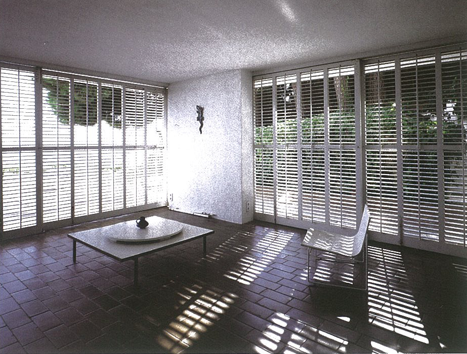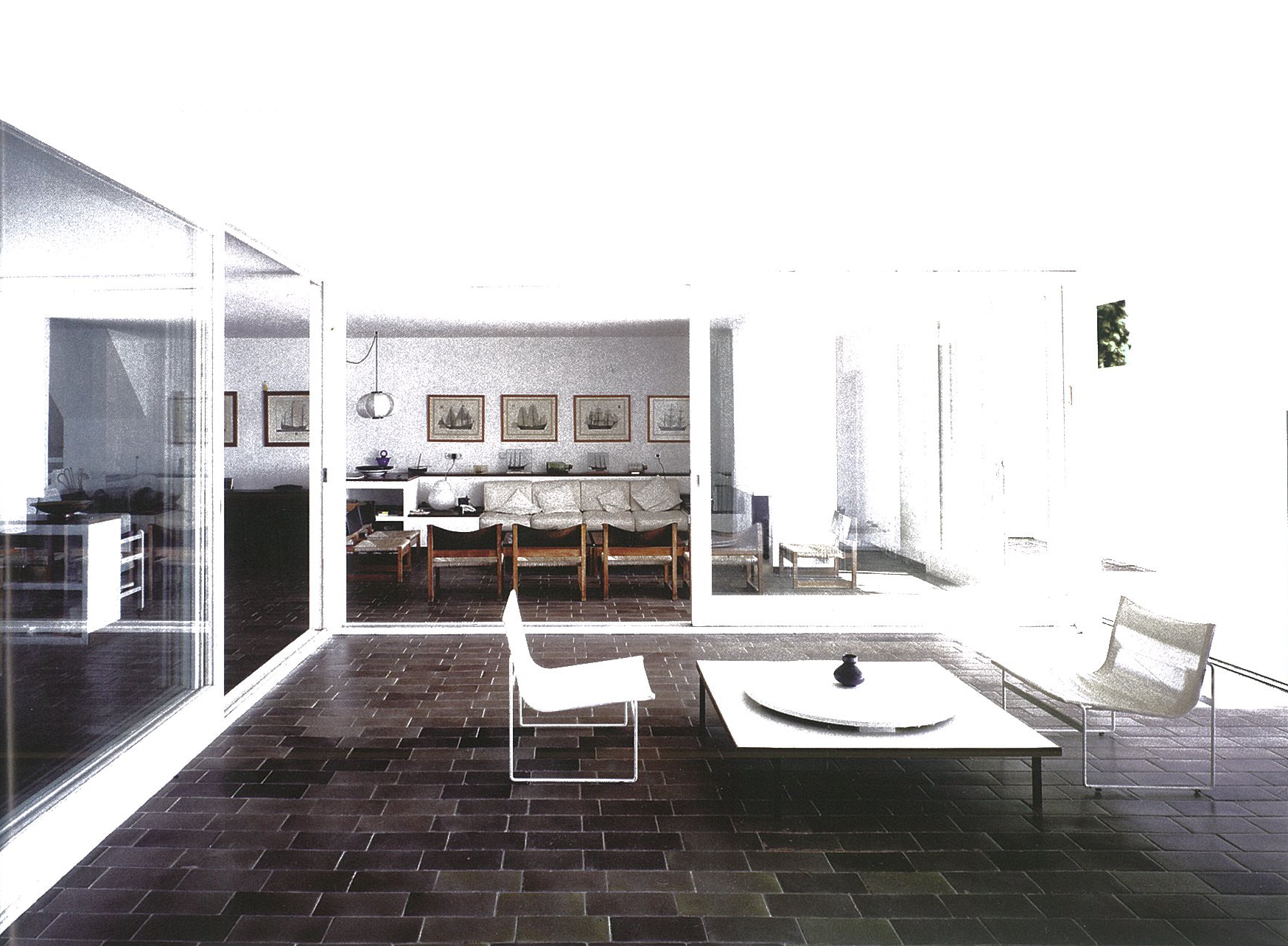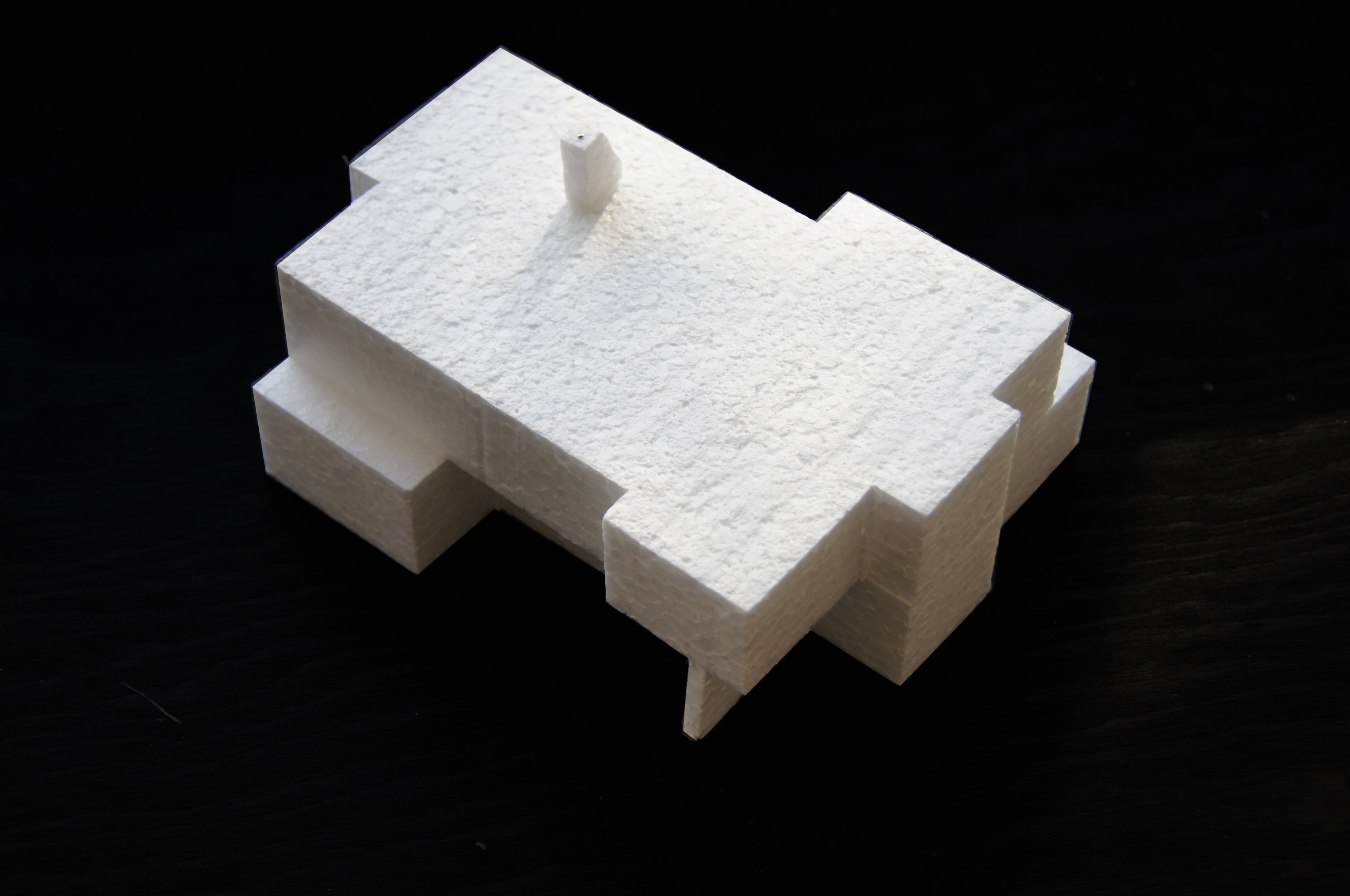 Mit einer Verschiebung der Schotten und der Einfügung des vertikalen Raumes über beide Geschosse entstehen unterschiedlich grosse Öffnungen zwischen den Räumen. Diagonalbezüge in der horizontalen, wie auch in der vertikalen Ebene werden geschaffen. Die Materialwahl unterstützt die Bezüge, das Weiterführen der Materialien von Innen nach Aussen führt zum Verschwinden der Raumgrenzen.